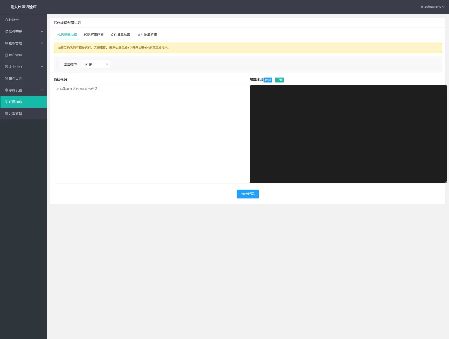 鼠大侠网络验证系统是一套轻应用的软件授权验证解决方案,专为软件开发者设计。采用PHP+MySQL架构,支持一机一码授权、福利码激活、试用功能、心跳检测等,帮助开发者轻松实现软件的授权管理和防破解保护。