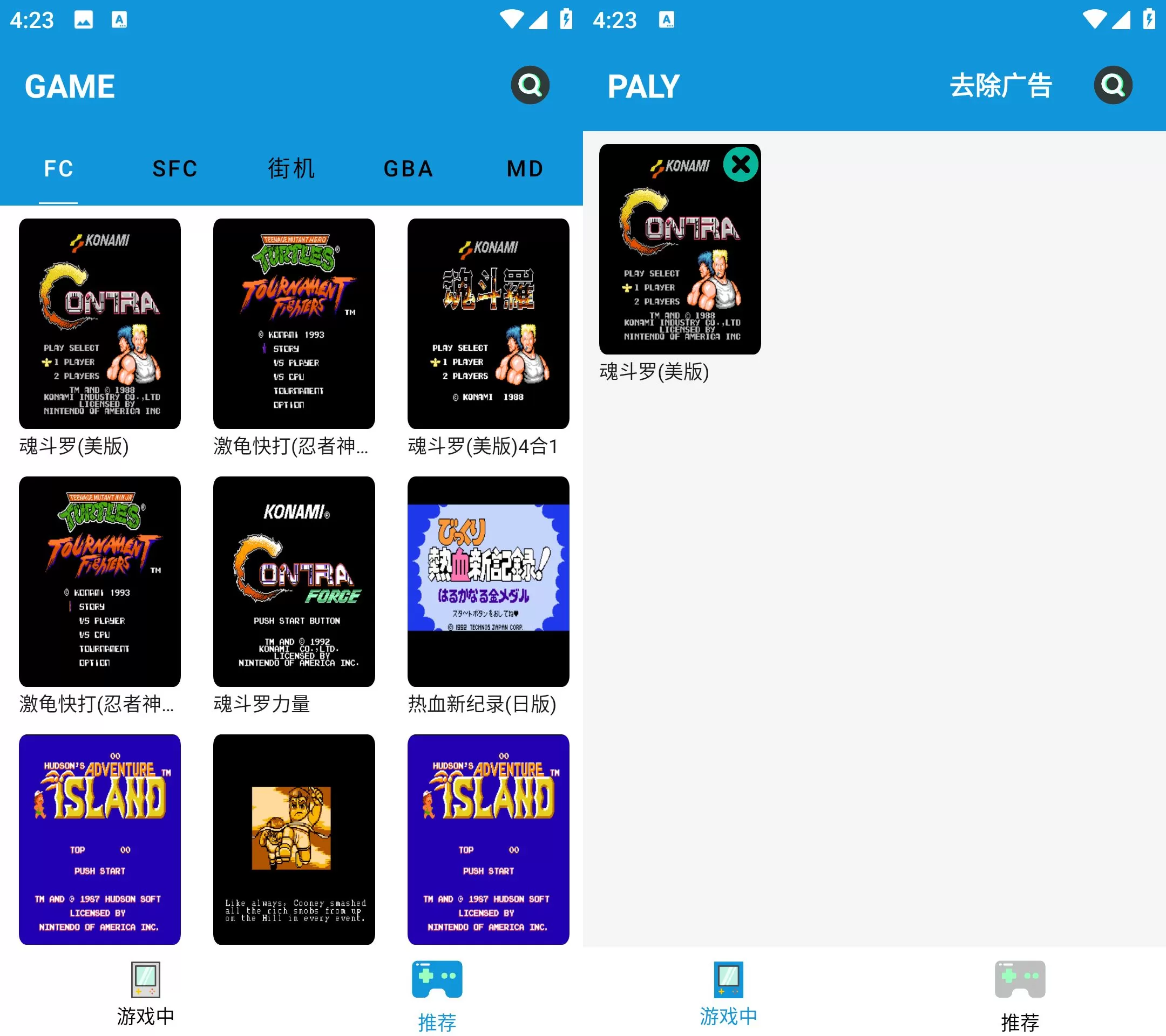 游戏一共分为五类,像FC、SFC、街机、GBA、MD、H5游戏统统都有,压根不用担心想玩的游戏找不到。