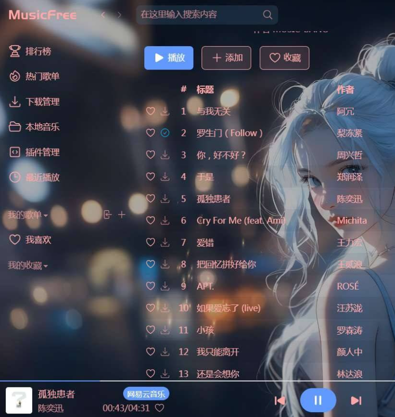 云梦网 2025年11月30日 字数:45,阅读约1分钟 全屏显示 已售: 0 洛雪音乐魔改版v1.8.73纯净版聚合五大音乐平台支持无损下载 分类: 影音图像 浏览: 13 发布: 2025年11月30日 更新: 2025年11月30日 免费资源,请尊重版权所有。 请先登录 软件介绍听歌及下载: 提供普通、高品质、无损APE、无损FLAC,臻品母带等多种音质软件截图 洛雪音乐魔改版 本文作者:云梦网本文链接: https://yunmengw.com/yytx/67.html 版权声明:本博客所有文章除特别声明外,均默认采用 CC BY-NC-SA 4.0 许可协议。 文章很赞!支持一下吧 还没有人为TA充电 为TA充电 还没有人为TA充电 00洛雪音乐魔改版v1.8.73纯净版聚合五大音乐平台支持无损下载海报分享QQ分享QQ空间微博分享复制链接 支付宝扫一扫 微信扫一扫 感谢支持 文章很赞!支持一下吧