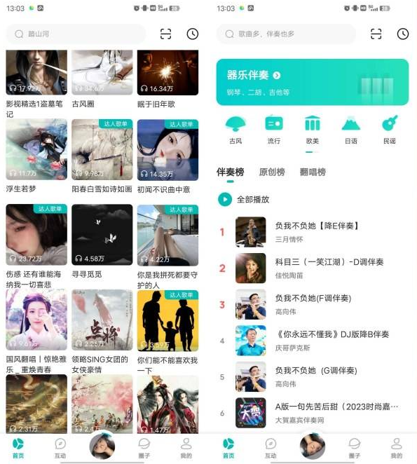 伴奏曲风丰富,覆盖古风、流行、民族、民谣、纯音乐等,提供伴奏播放、下载等服务,更有专门的伴奏搜索分类,让用户快速找到想要的伴奏。